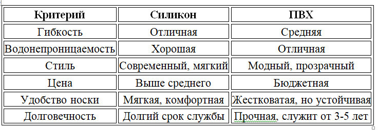 Оба материала имеют свои преимущества, но если рассматривать сочетание цены, практичности и модного эффекта, поливинилхлорид остается оптимальным вариантом для большинства случаев. Если вы хотите купить надежный аксессуар, который прослужит долго и подойдет под разные наряды, обратите внимание на прочные прозрачные модели.